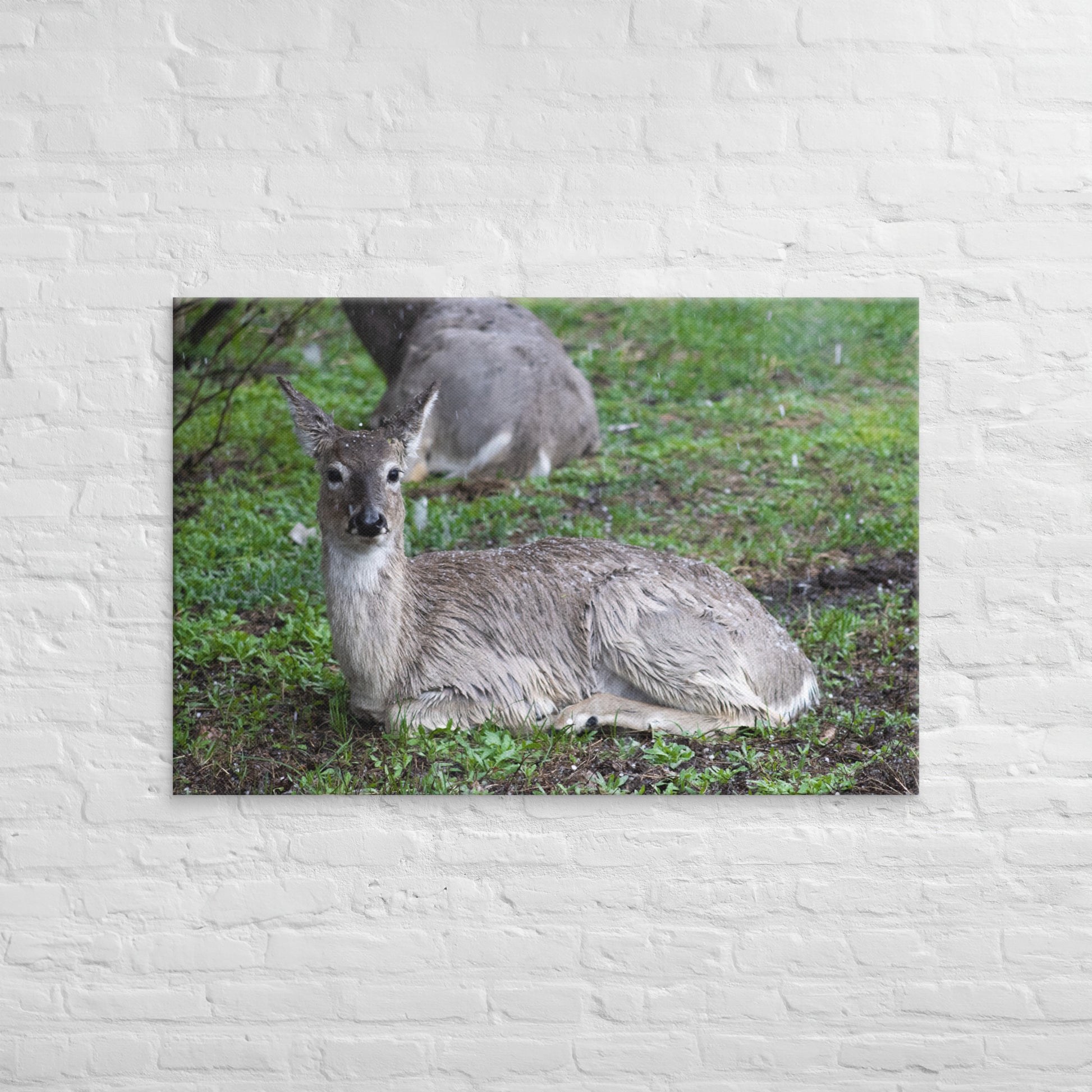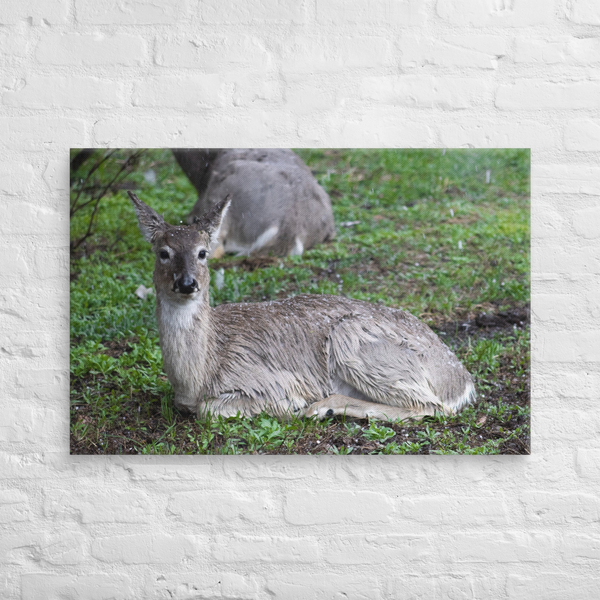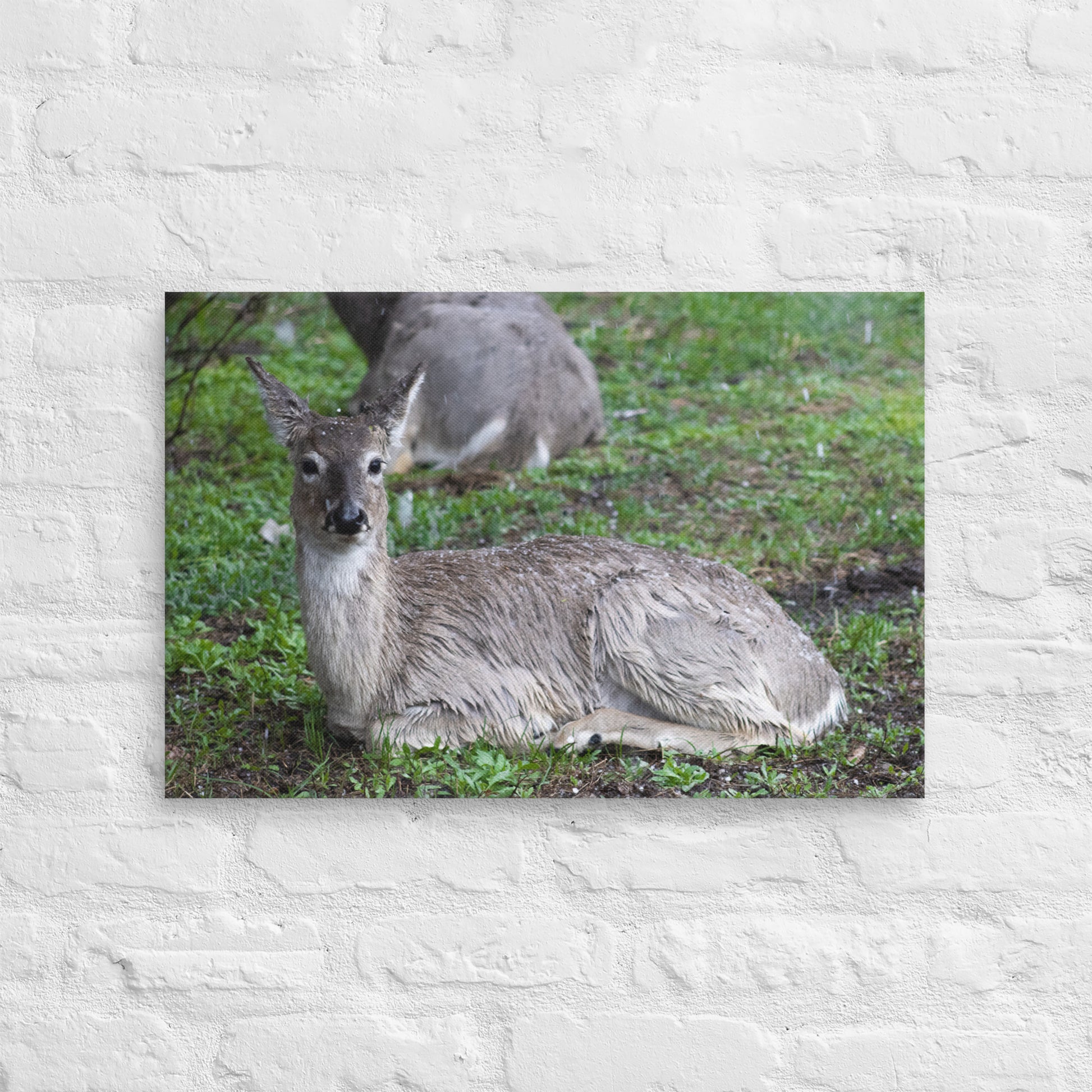 A young fawn does it's best to hide from the pouring rain in Red Lodge, Montana.