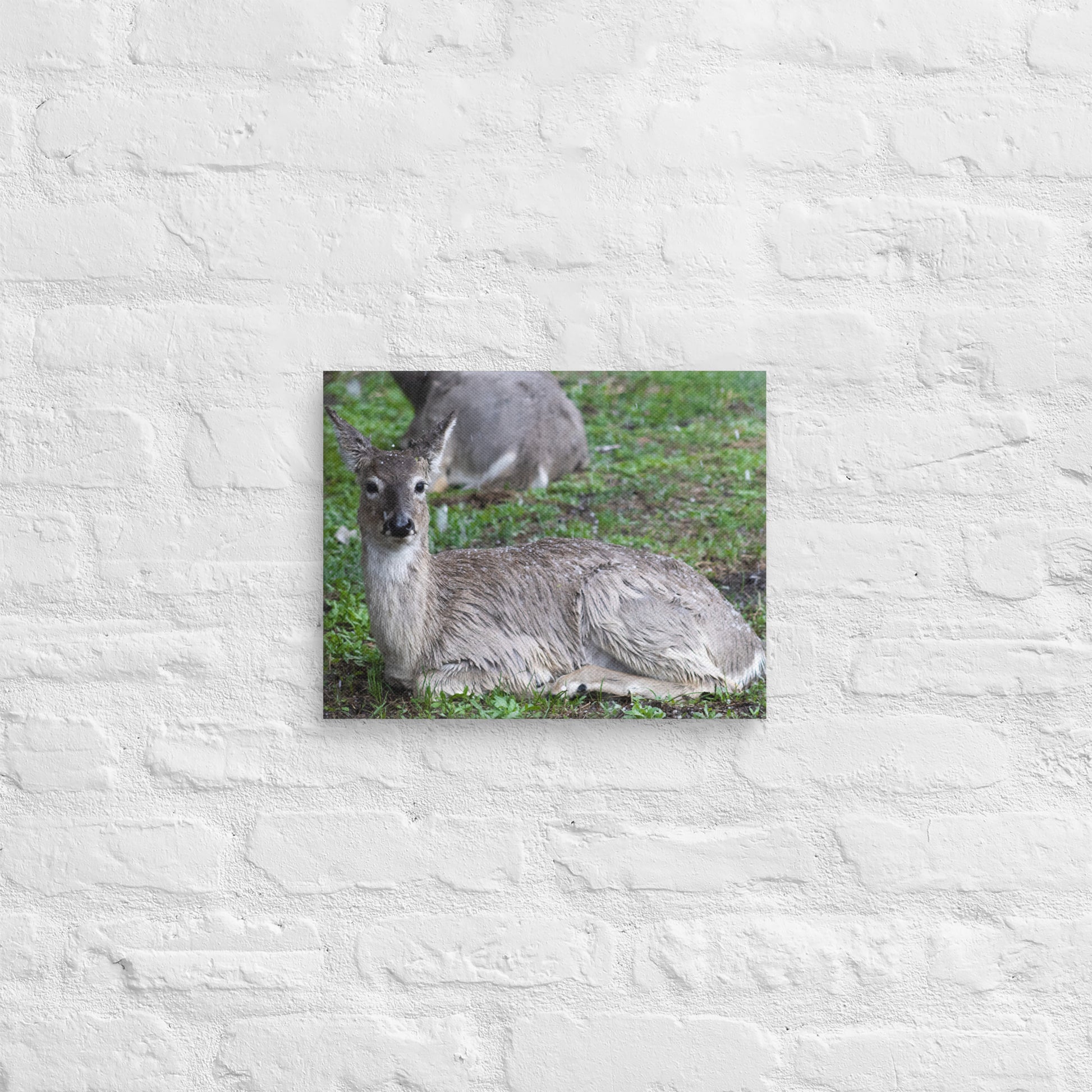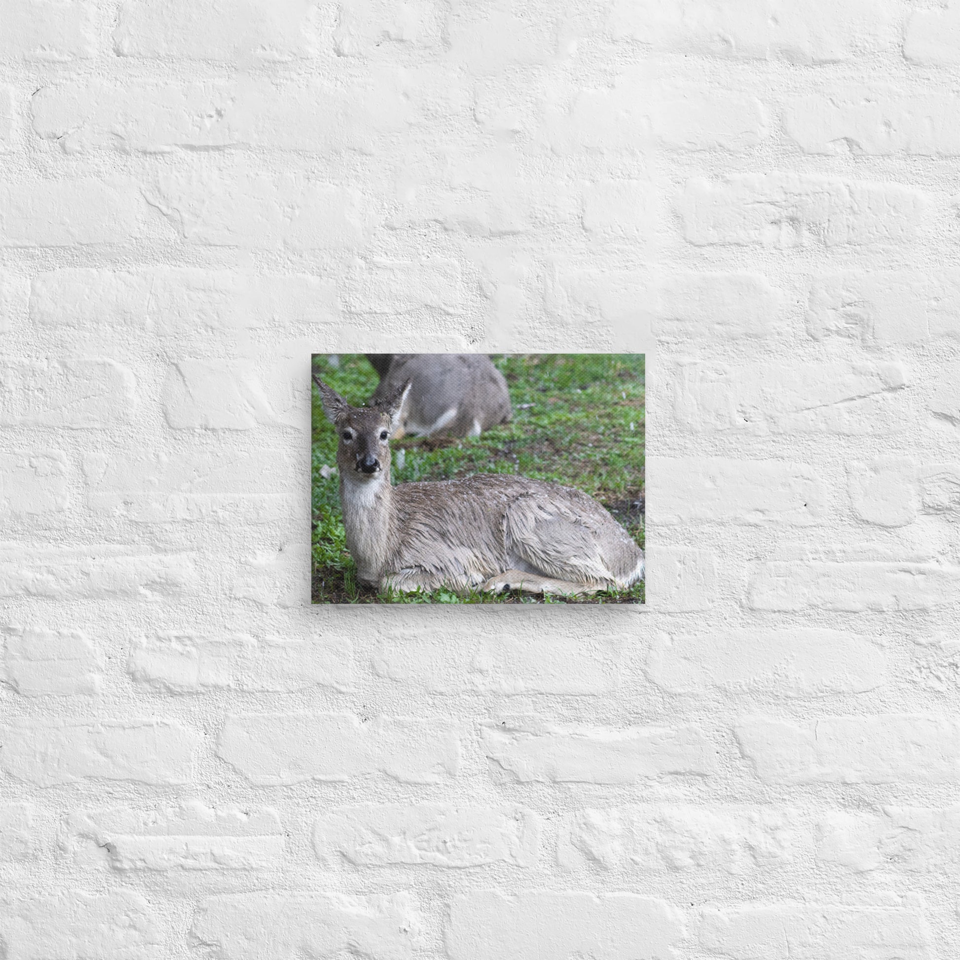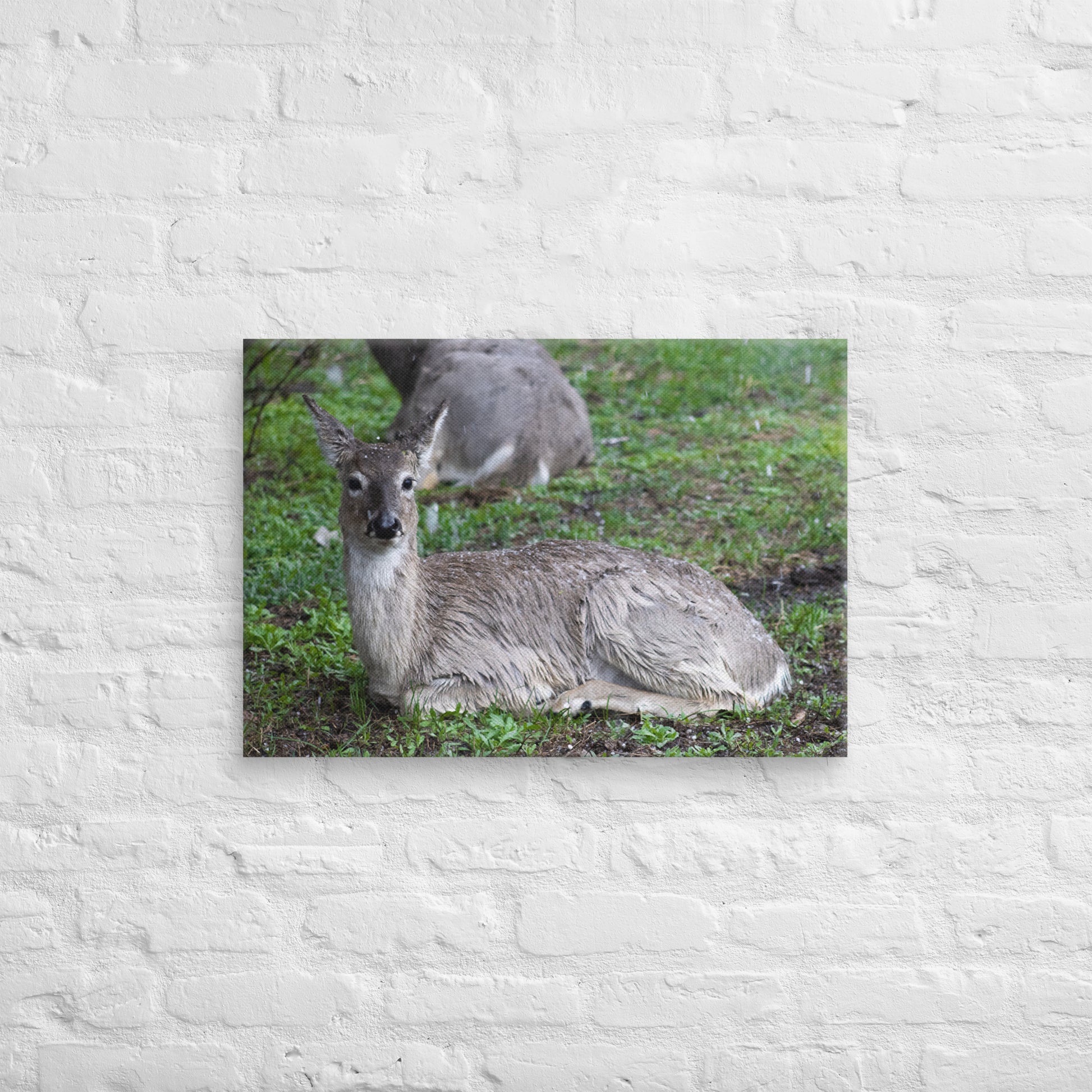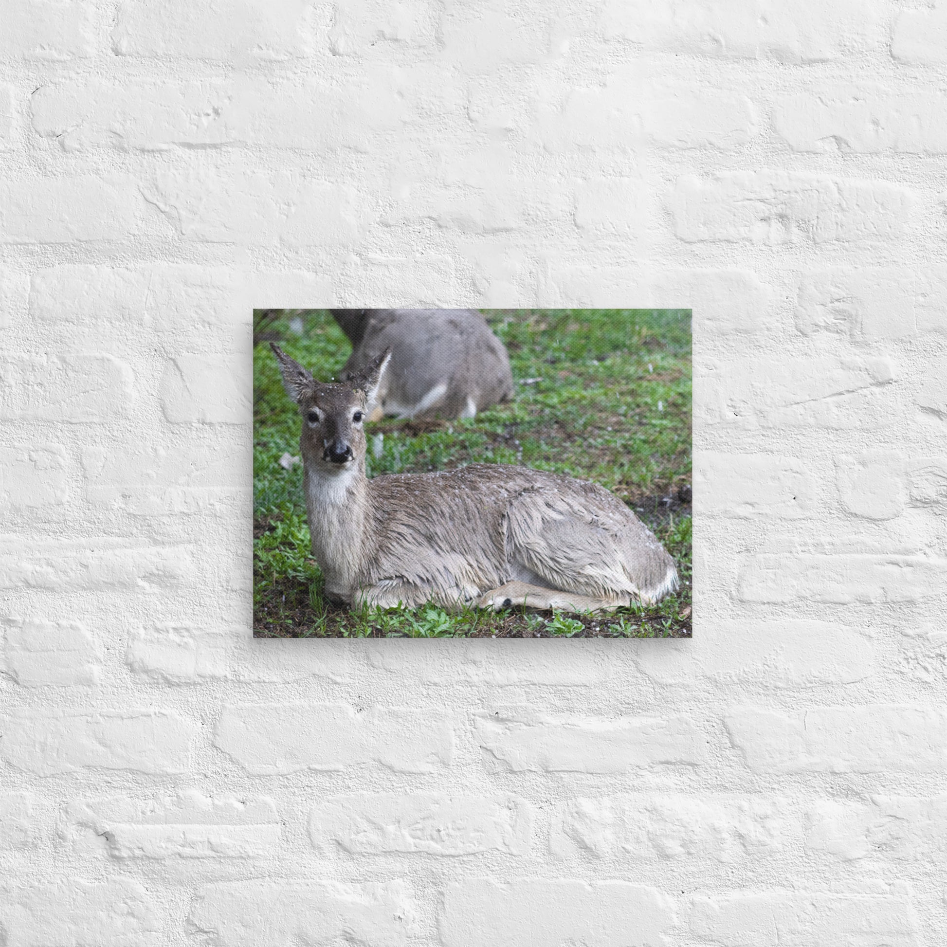 A young fawn does it's best to hide from the pouring rain in Red Lodge, Montana.